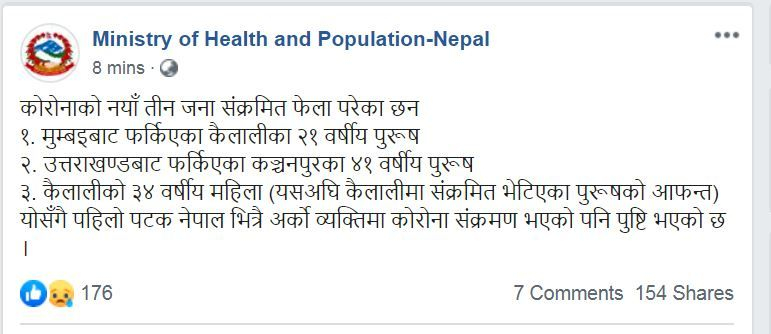 संक्रमितमा भारतको मुम्बइबाट फर्किएका कैलालीका २१ वर्षीय पुरूष, भारतकै उत्तराखण्डबाट फर्किएका कञ्चनपुरका ४१ वर्षीय पुरूष र कैलालीकी ३४ वर्षीय महिला रहेको मन्त्रालयको पेजमा उल्लेख गरिएको छ। यी महिला यसअघि कैलालीमा भेटिएका संक्रमित पुरूषकी आफन्त भएको पनि मन्त्रालयले जनाएको छ। योसँगै पहिलो पटक नेपाल भित्रै अर्को व्यक्तिमा कोरोना संक्रमण भएको पनि पुष्टि भएको छ।