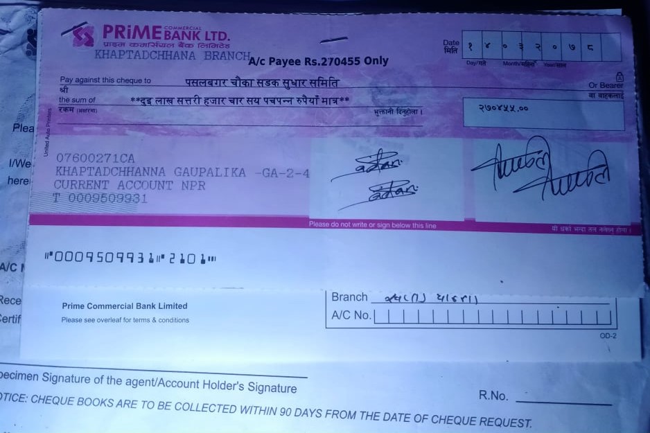 गाउँपालिकाले भुक्तानी गरेको चेकमा पनि चार दिन अगाडी काटिएको र चार दिन पछि काटिएको चेकको सिरियल नं शंकास्पद रहेको छ । पसल बगर चौका सडक सुधार समितिको नाममा असार १४ गते काटिएको प्राइम बैङकको चेकको सिरियल नं ०७६००२७१ सीए रहेको छ भने त्यसको चार दिन पछि सिल्का घट्ट सिचाई कुलाको नाममा काटीएको चेकको सिरियल नं ०७६००२७० सिए रहेको छ । यो घटना गाउँपालिकाको असावधानीका कारण सार्वजनिक भएको भए पनि यस्ता अरु थुप्रै गलत काम भएको हुन सक्ने भएकोले पालिकाका सम्पुर्ण गतिविधीको छानविन हुनु पर्ने स्थानियले बताए ।
