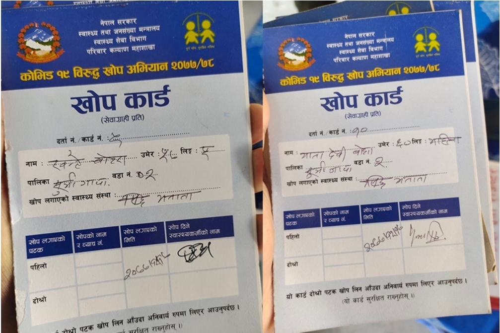 बझाङ । खोप कार्डमा कारोना खोपको नाम र ब्याच नम्बर नहुँदा सुर्माका नागरिक कोरोना खोपको दोस्रो मात्राबाट बञ्चित भएका छन्। सुर्माको सिद्ध मनाना स्वास्थ्य चौकी खोप केन्द्रबाट २०७७ चैत १७ मा पहिलो मात्रा लगाएका सेवाग्राहीको खोप कार्डमा खोप लगाउने स्वास्थ्यकर्मीले खोपको नाम र ब्याच नम्बर उल्लेख छैन। जिल्ला स्वास्थ कार्यालयले बझाङमा बिहीबार र शुक्रबार दोस्रो मात्रा खोप लगाइएको थियो। त्यहाँ दोस्रो मात्रा लगाउन पुगेका सुर्मा(२ का ५७ वर्षीय खन्टे बोहरा, ६० वर्षीया मातादेवी बोहरा, ७४ वर्षीय अंगे बोहरालगायतले खोप कार्डमा खोपको नाम र ब्याच नम्बर नभएकाले दोस्रो मात्रा लगाउन पाएनन्।
