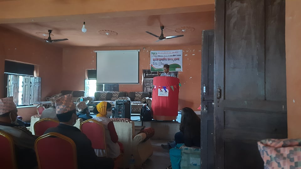 रिदम सिंह, बझाङ । जिल्ला सदरमुकाम चैनपुरमा शुक्रवार सरोकारवाला निकायहरु संग खाद्य अधिकार उलंघनका सवाल सम्बन्धि अन्र्तसम्वाद कार्यक्रम भएको छ । फियान नेपालको आयोजनामा आज जिल्लाका सरोकारवालाहरु संग खाद्य अधिकारका सवालमा अन्तरसम्वाद भएको हो ।