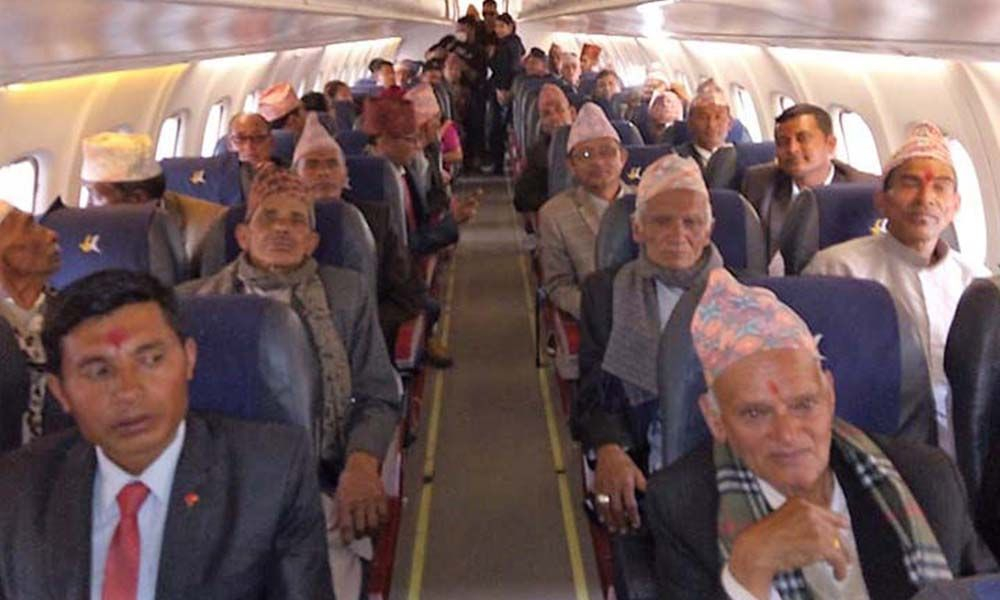 महालक्ष्मी नगरपालिका ९ का नगेन्द्र थापाका छोरा दिनेशको विवाहका क्रममा जीतपुरबाट काठमाडौँमा जन्ती आतेजातेक्रममा बुधवार चार्टर गरिएको प्लेनमा सवार जन्ती । जसमध्ये अधिकांश जेष्ठनागरिक पहिलो पटक काठमाडौँको यात्रामा थिए । तस्बिर सौजन्य : रामबहादुर थापा ।