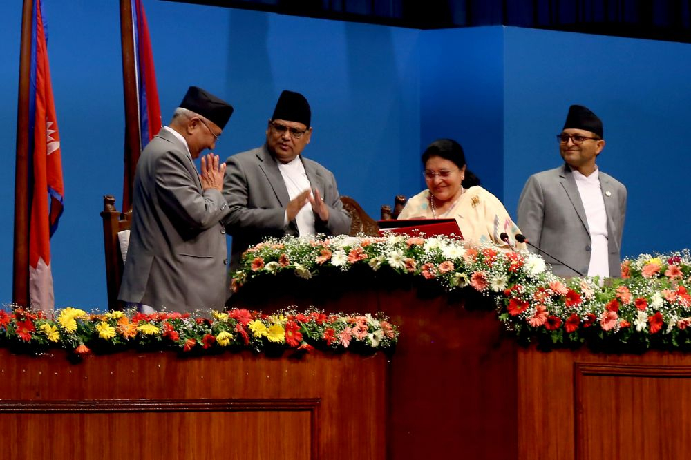 ३.गत वर्ष २०७५ जेठ ७ गते सङ्घीय संसदको दुवै सदनको संयुक्त बैठकलाई मैलेगरेको सम्बोधनमार्फत् सरकारको संविधान कार्यान्वयनप्रतिको प्रतिबद्धता र राजनीतिकआदर्श एवं कार्यदिशा प्रस्तुत भएको थियो। समृद्ध नेपाल, सुखी नेपालीको राष्ट्रियआकाङ्क्षा प्राप्त गर्न आर्थिक, सामाजिक, सांस्कृतिक विकासका उद्देश्य, लक्ष्य,रणनीति र कार्यनीतिसहितको स्पष्ट राष्ट्रिय खाका निर्धारण गरिएको थियो। नीति रकार्यक्रमको प्रभावकारी कार्यान्वयन गरी तथ्य र तथ्याङ्कमा नतिजा ल्याउने सङ्कल्पगरिएको थियो। यिनै राष्ट्रिय कार्यभार पूरा गर्न मेरो सरकार काम गर्दैछ, नतिजाल्याउँदैछ र अघि बढ्दैछ।